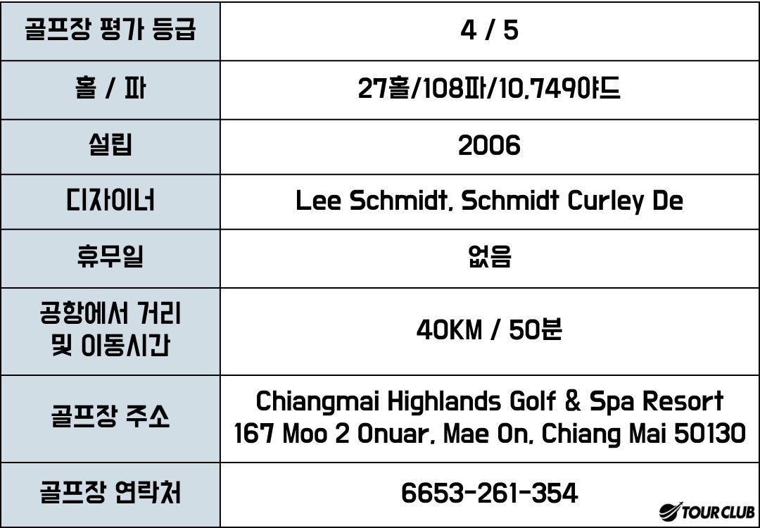 19개의 프라이빗 리조트 빌라, 치앙마이 하이랜드의 스파, 콘도미니엄과 세련된 주택 개발로 치앙마이 하이랜드는 태국 북부에서 최고의 골프 휴가지가 되었습니다. 최상급 시설, 친절한 란나 타이 서비스, 깨끗한 경기 조건을 갖춘 세계 정상급 골프의 조합으로 치앙마이 하이랜드 골프와 스파 리조트는 전설적인 골프 경험을 제공한다는 명성을 얻었습니다.