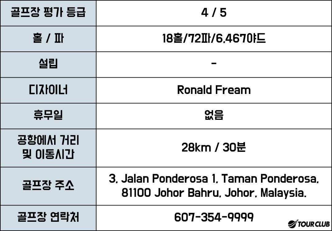 조호르(Johor) 골프 코스는 1996년 Ronald Fream에 의해 리모델링되었으며 팁에서 6467m의 높이를 자랑합니다. 일부 골퍼들에게는 짧은 코스로 여겨지지만, 폰데로사에는 모래와 워터 해저드가 많고, 기복이 심한 그린이 있어 최고의 골퍼들에게도 도전이 됩니다. 게다가 긴 파3 홀, 언덕을 중심으로 형성된 페어웨이, 강한 바람 등이 이 조호르 골프장의 도전을 더욱 돋보이게 합니다.
