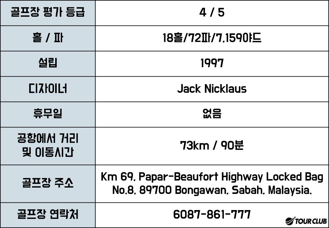 의심할 여지 없이 세계 최고의 골퍼이자 가장 다작하고 인기 있는 디자이너 중 한 명인 니클라우스는 앞 나인 홀의 대부분에 물이 전달하는 효과를 극적으로 표현하기 위해 천연 라군을 사용했습니다. 주변 환경의 아름다움으로 인해 백 나인에서 거친 바다 바람과 싸우면서 골프에 집중하기가 어렵습니다. 호수, 전략적인 벙커, 빠른 그린, '세미 링크 디자인 컨셉'이 적용된 항상 바람이 어우러져 보르네오 골프 & 컨트리 클럽은 말레이시아의 모든 골퍼 에게 좋은 플레이가 됩니다 .