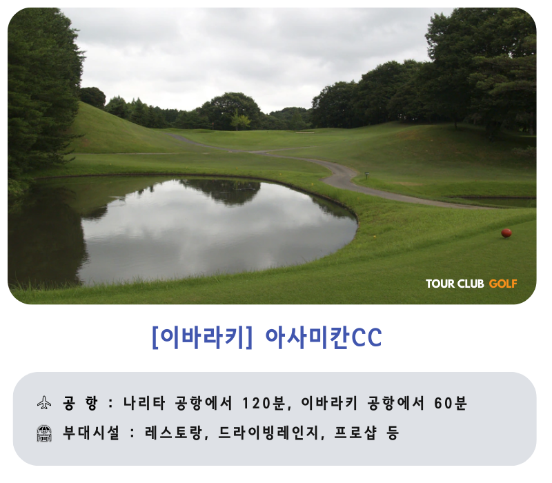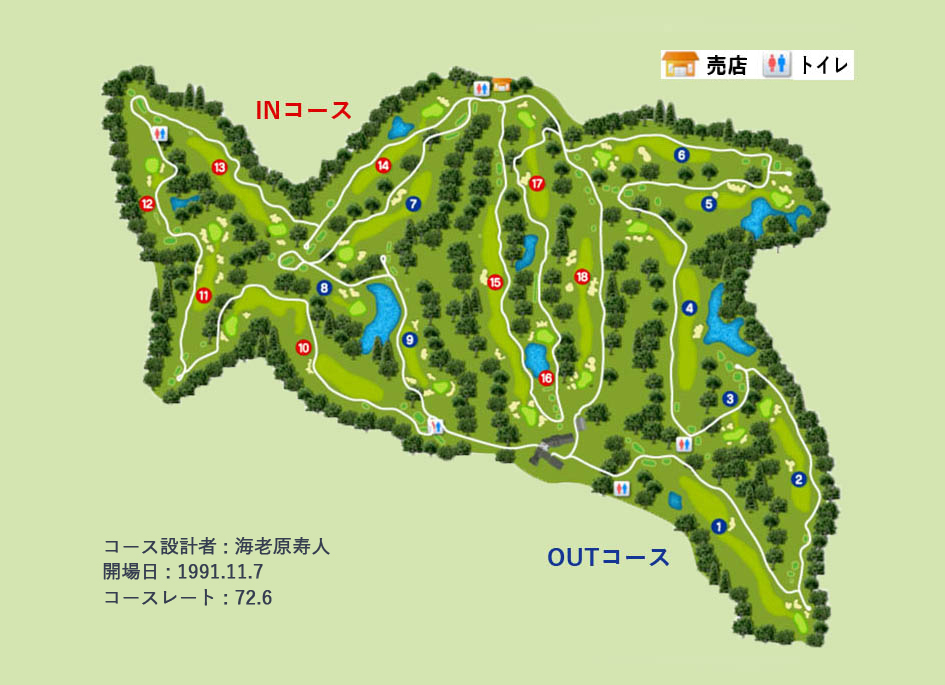 2017년에 클럽 하우스의 개수를 실시해, 모던하고 캐주얼이면서도 차분한 디자인이 된 것으로 젊은층의 분이나 여성에게도 부담없이 행차 받을 수 있는 분위기가 되고 있습니다. 개장 1974년의 명장 아사미 녹장 설계의 27홀의 코스입니다. 설계자:아사미 미도리조(최연소 메이저 챔피언) 1979년에는 일본 프로 골프 선수권도 개최된 토너먼트 코스입니다. 10만평의 무구 연못에 안겨진 임간 코스는 점재하는 크고 작은 다양한 연못을 배치하여 전략적 가치를 높이고 있습니다. 또, 코스 메인터넌스, 그린 컨디션은 항상 높은 평가를 받고 있습니다. 초보자부터 상급자까지, 몇 번 플레이해도 질리지 않는 코스입니다.