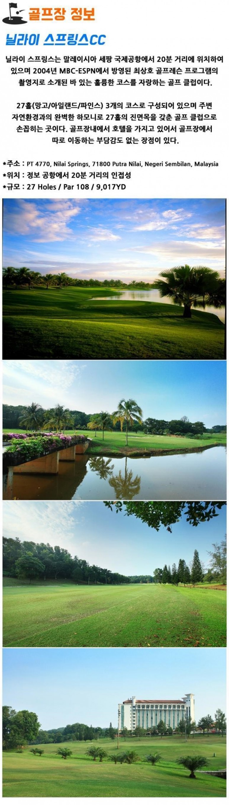 | 코타키나발루 | 전일 | 호텔 조식 후 골프장으로 이동 닐라이스프링스 CC (주중18홀/주말 18홀 라운딩) 석식후 공항으로 이동 |