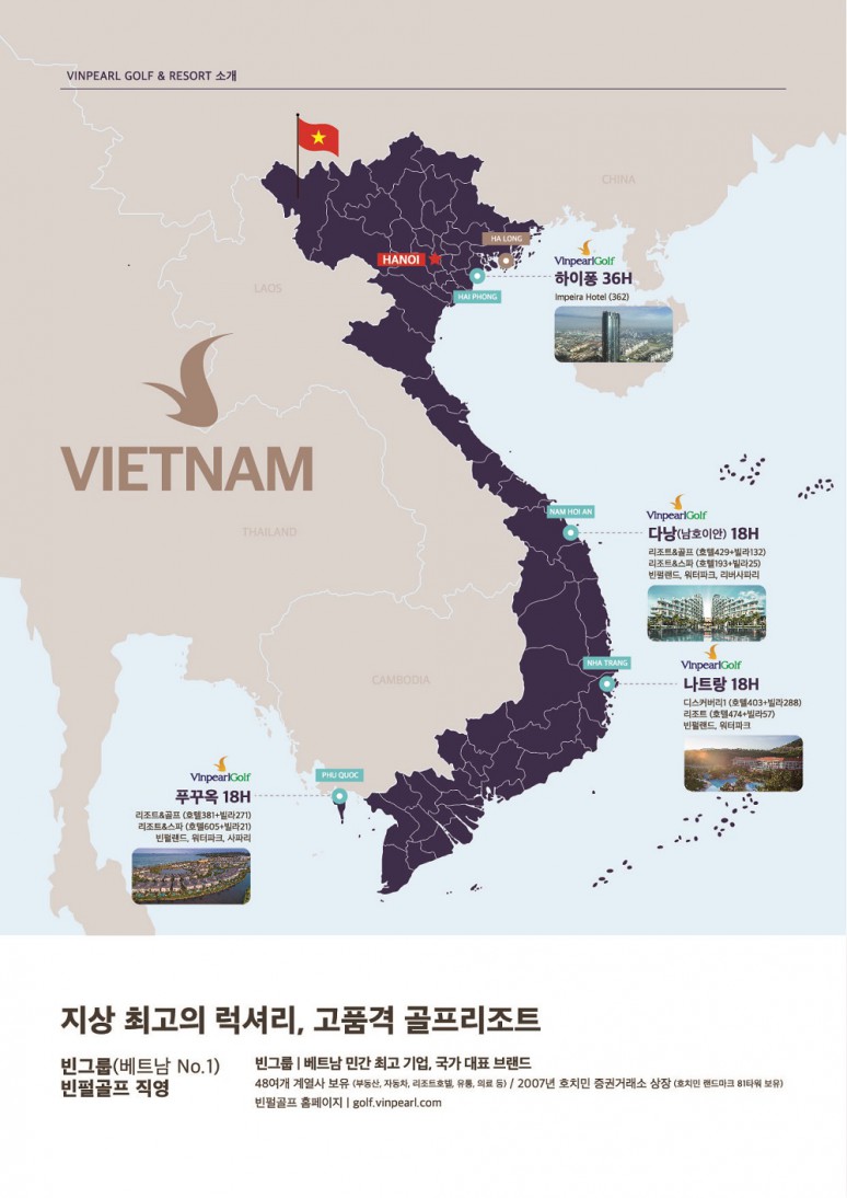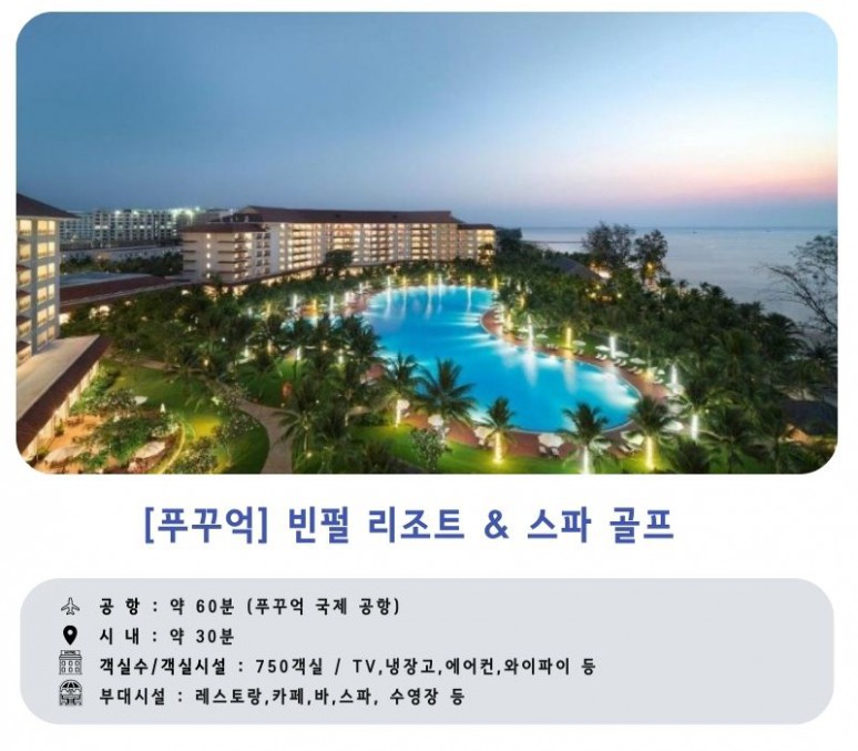 베트남 푸꿕섬에 위치하여 있으며 27홀 챔피언쉽 코스로, 개장 이전 부터 많은 관심을 받았으며 빈펄 그룹에서 운형하는 럭셔리한 리조트 골프 클럽입니다. 세계적으로 유명한 골프코스 설계회사인 IMG의 설계및 디자인으로 완공 되었습니다.