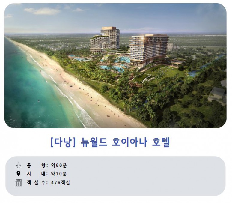 다낭의 떠오르는 대표 복합 리조트 단지이며 476룸 / 2레스토랑 / 3미팅룸 / 1그랜드볼룸홀이 있씁니다. 유네스코 세계문화유산인 호이안과 15분 거리 인접합니다.