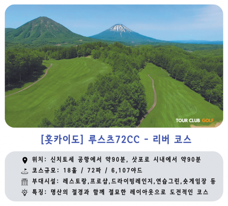 - 루스츠 72CC : 북해도의 자연을 최대한 살린 개성 넘치는 4개의 코스로 이루어진 북해도 최대 규모의 골프장입니다.