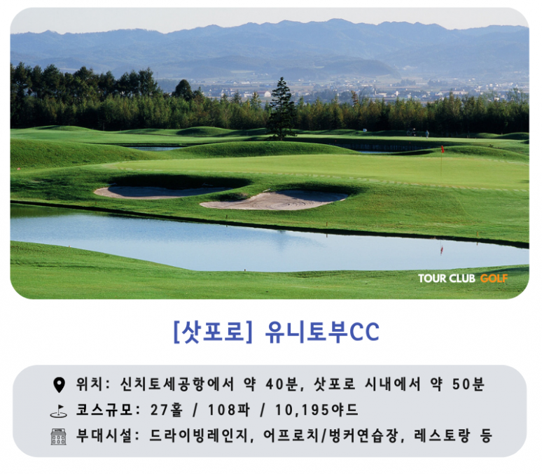 일본 큐슈 재벌기업인 토브 그룹에서 운영 및 관리하는 27홀 규모의 유니토부CC는 스코어 입력이 가능한 GPS 네비게이션을 탑재한 카트를 운영하는 등 최첨단 시스템을 갖추고 있어서 골퍼들이 셀프 플레이를 즐기시는데 부족함이 없습니다. 카트로 페어웨이 진입이 가능하여 홋카이도의 대자연이 키워낸 웅대한 필드를 제대로 느끼실 수 있습니다. 일본 코스 설계 장인 고바야시 미츠아키의 도전적인 철학이 담긴 레이아웃으로 북해도 베스트 10에 선정된 바 있습니다. 워터 해저드가 도전 정신을 자극하는 [물 코스], 홋카이도만의 장대한 스케일에 압도되는 [빛 코스], 자연의 지형을 살린 다채로움을 즐기는 [바람코스]가 최고의 라운드를 선사합니다.