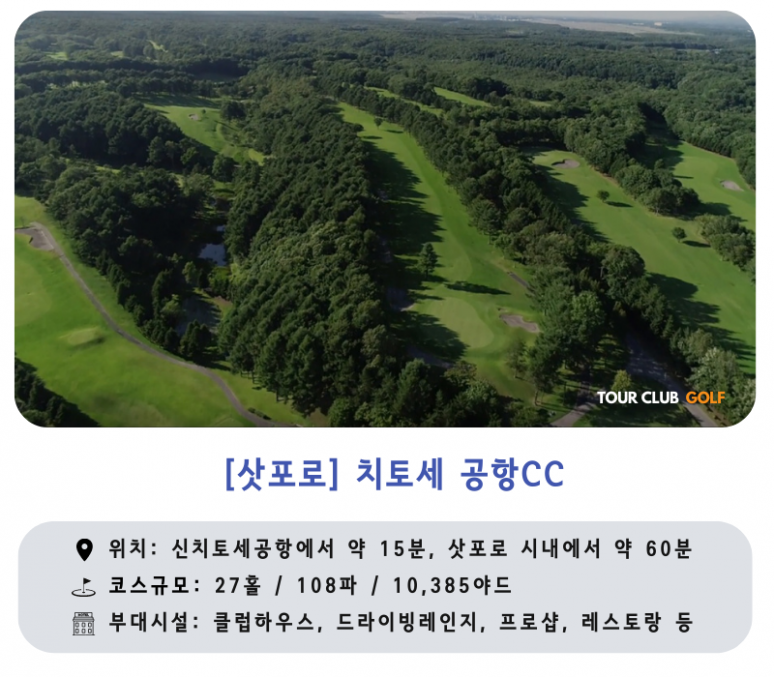 - 치토세공항CC : 비기너부터 싱글 플레이어까지 다양한 골퍼들을 만족시키는 코스로 치토세 공항과 접근성이 매우 좋습니다.