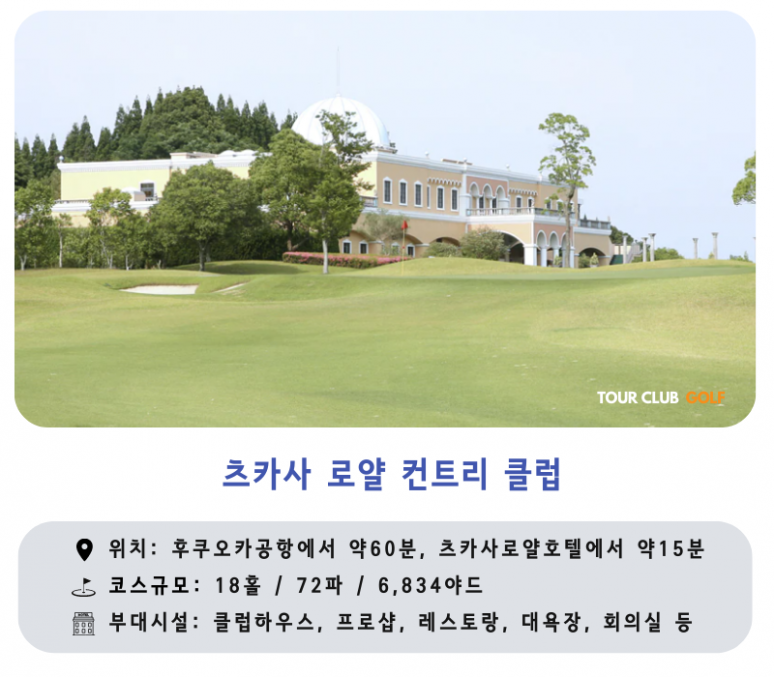 - 츠카사 로얄CC : 세계적인 코스 설계사 로버트 트랜스존스 주니어가 설계한 전략성이 풍부한 명문 클럽입니다.