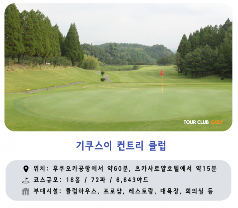 - 기쿠스이CC : 넓은 페어웨이와 기복이 적은 평탄한 코스로 편안하게 공략이 가능하며 그린 주변의 미묘한 언쥴레이션으로 재미를 더한 클럽입니다.