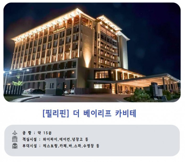 인천 국제공항 출발 마닐라 국제항공 도착 가이드 미팅 후 호텔로 이동 호텔 체크인 후 투숙 및 휴식 |