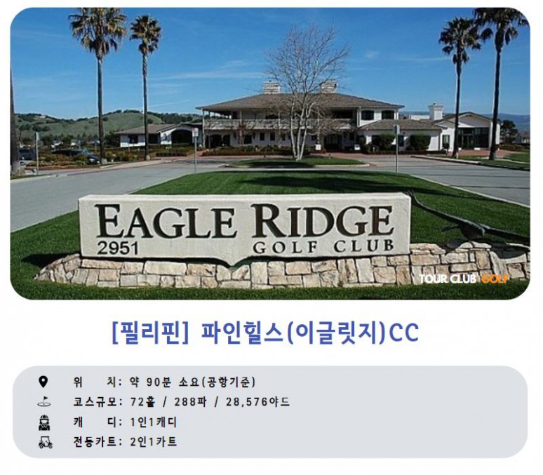 이글릿지CC는 필리핀 마닐라 남서쪽 50km 떨어져 있는 카비테 지역에 위치한 정규 72홀 골프장으로 마닐라에서 차량으로 약 1시간 20분 소요되며 필리핀 최대의 골프 클럽입니다.