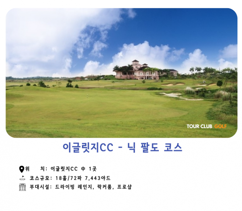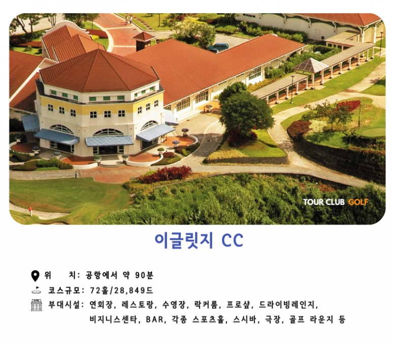 총 전장 28,849의 을 가진 이글릿지 골프 클럽은 세계적으로 유명한 골프 코스 디자이너 4명이 조인해 각 개인의 출신 나라의 컨셉으로 클럽하우스를 만들고