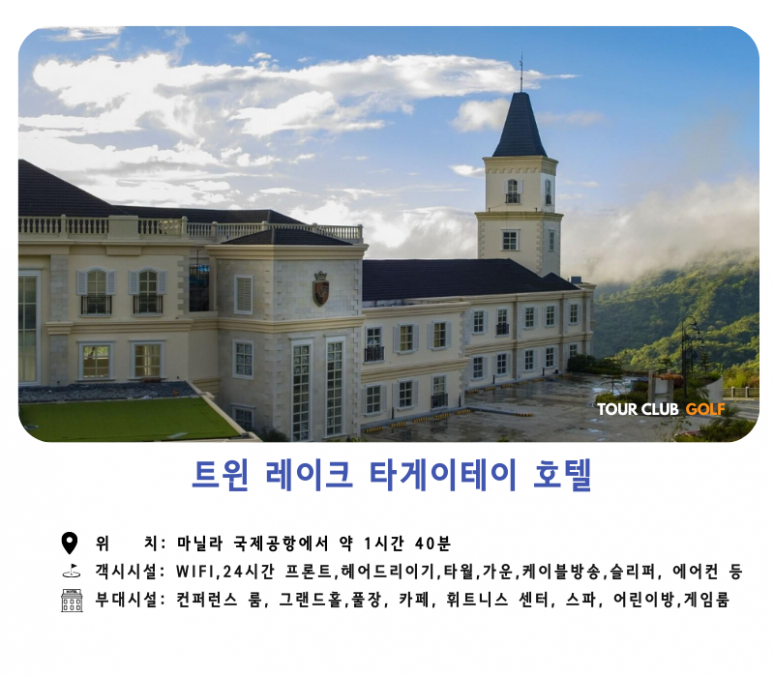 트윈 레이크 호텔은 5성급 호텔로 마닐라 국제공항에서 약 1시간 40분정도 떨어진 위치에 있습니다.