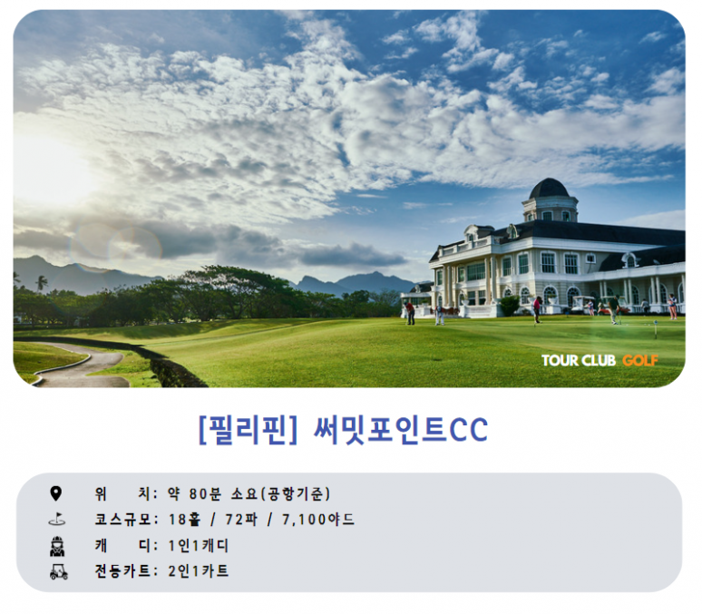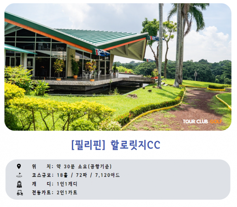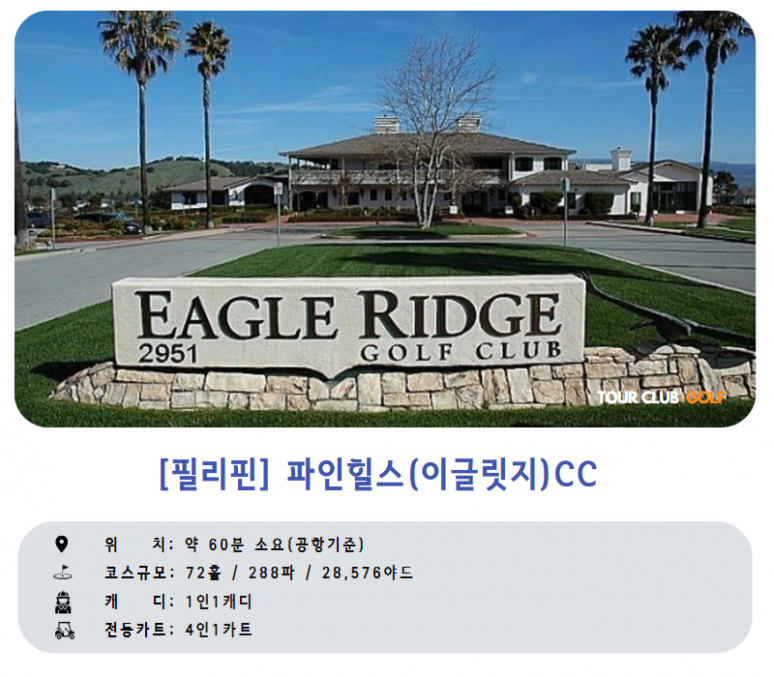 | 마닐라 | 조식 후, 골프장으로 이동 파인힐스(이클릿지),깐루방,써밋포인트,할로릿지CC 중 1곳 18홀 라운딩 석식 후, 호텔로 이동 및 휴식 |