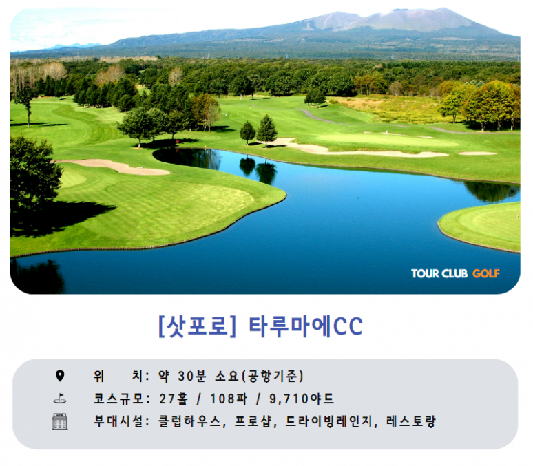 1963년에 개장한 타루마에CC는 일본의 코스 설계의 명장 우에다 오사무에 의해 설계되었다. 일본 여자 오픈 토너먼트가 개최되었던 홋카이도에서도 명문코스로 자리매김을 했으며 태평양과 타루마에산의 웅장한 풍경을 바라보며 호쾌한 샷을 즐길 수 있고, 넓고 길게 뻗은 코스는 다른 어느 곳 보다도 홋카이도다운 멋을 즐길 수 있는 곳이라 할 수 있다.