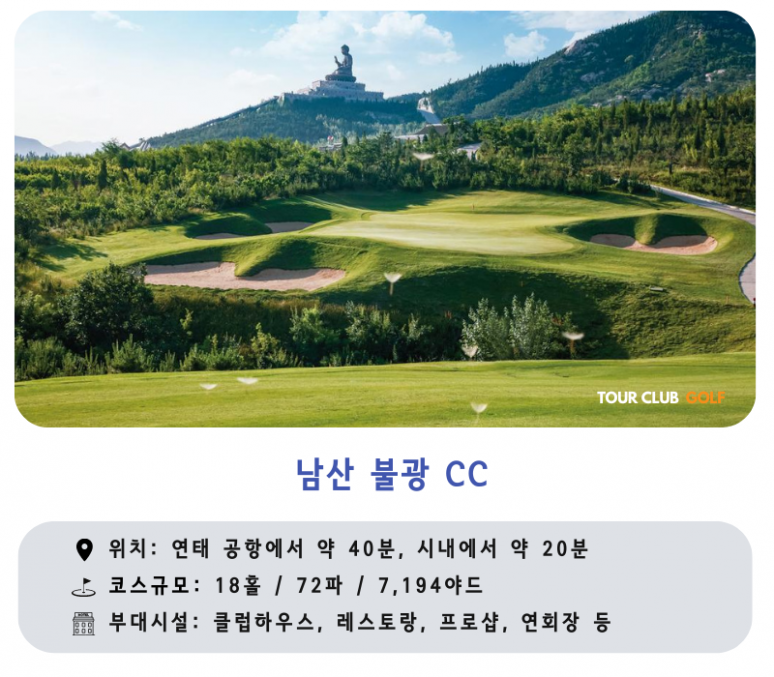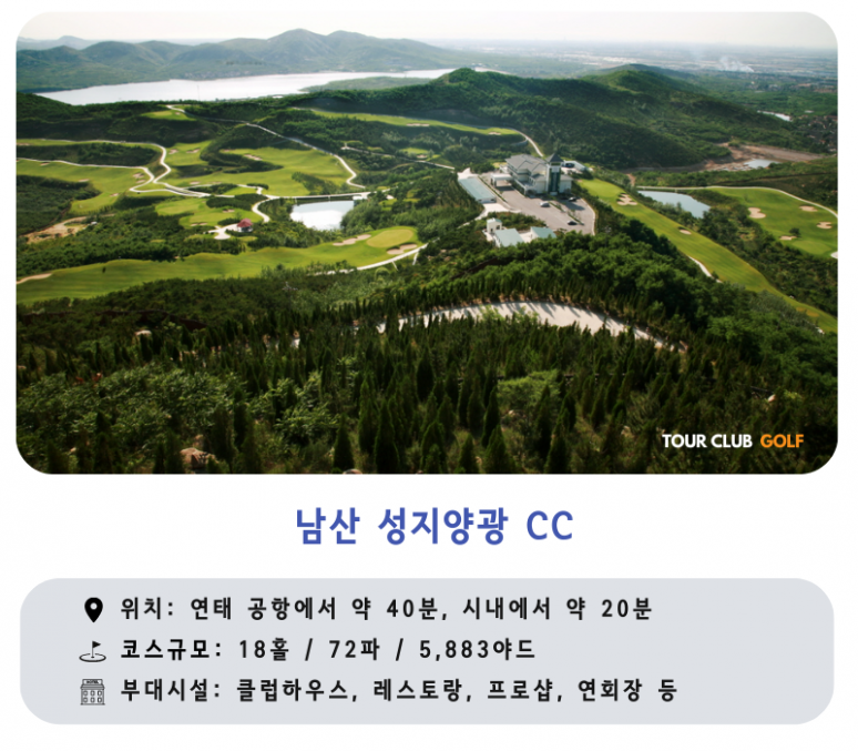 조식 후 현지인 직원 미팅 / 골프장으로 이동 (약 5~15분) ★ 국제CC or 불광CC or 성지CC 18홀 라운드 공항으로 이동 (약 40분) 연태 -> 인천 국제공항 도착 |