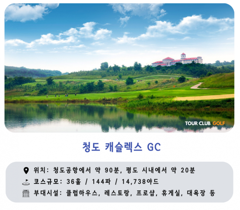 인천 공항 -> 청도 자오둥 공항 도착 도착 비자 발급 및 입국 수속 현지인 직원 미팅 후 캐슬렉스 골프클럽으로 이동 (약 90분) ★ 캐슬렉스GC 18홀 라운드 골프텔 체크인 후 휴식 |