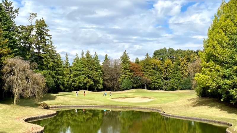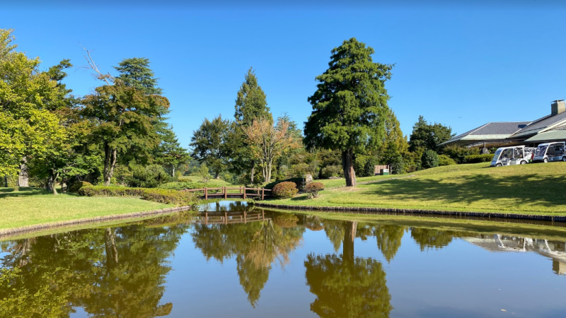 명물홀은 13번 쇼트홀. 관동 평야를 한눈에 볼 수 있는 아름다운 타격으로, 그린은 연못으로 둘러싸여 있습니다.