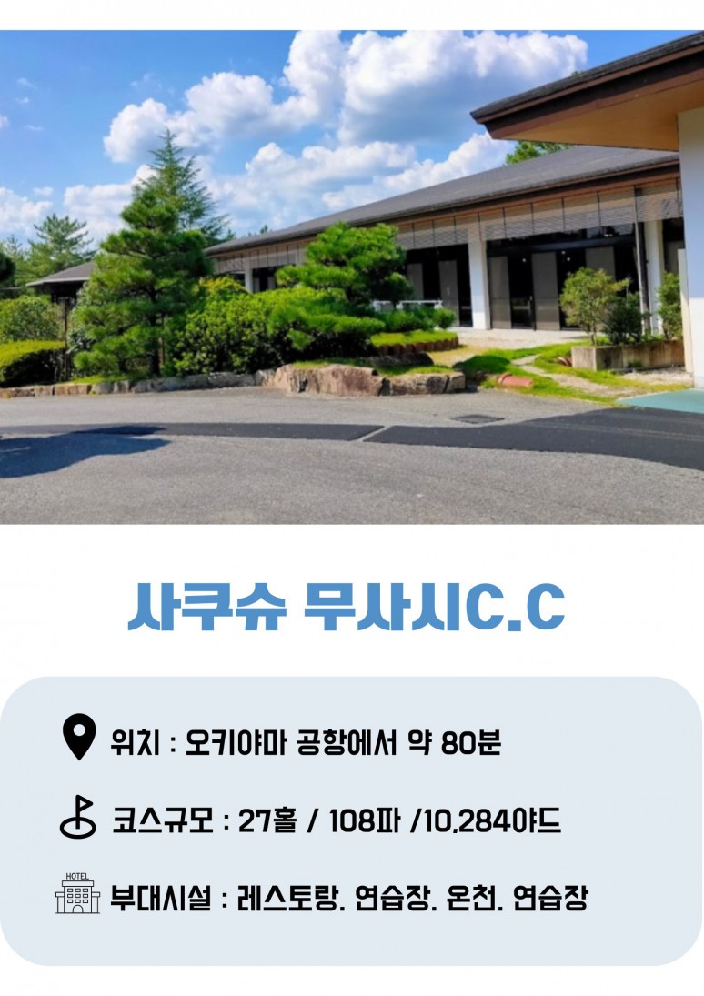 제2터미널 인천공항 출발 오카야마 공항 도착 후 기사 미팅(미팅보드:사쿠슈무사시 골프) 송영차량 탑승 후 골프장으로 이동 (약80분 소요) 골프장 도착 점심 식사 후 라운드 (사쿠슈무사시 18홀 라운드/일몰 시 까지) |