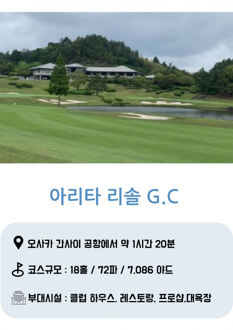 | 오사카 | 호텔 조식 후 골프장으로 이동 30-40분 아리타 리솔/라그레스/키난 컨트리클럽 또는 동급 - (4B 셀프 플레이) 18홀 플레이 호텔로 귀환 휴식 호텔 체크인 및 자유시간 |