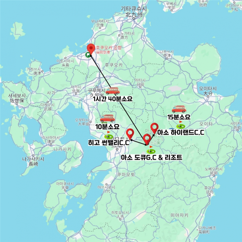 호텔 조식 후 골프장 이동(도보) 아소도큐GC 18홀 라운딩(셀프) 라운드 후 송영버스 탑승 및 공항으로 이동 후쿠오카 국제공항 출발 김해국제공항 도착 |
