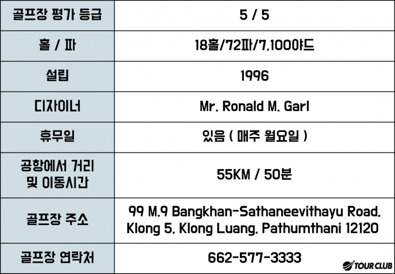 770라이의 걸작인 골프장으로 빠툼타니에 자리하고 있습니다. 여러분들의 모든 골프 기량을 보여줄 수 있는 잊을 수 없는 경험이 될 것입니다.