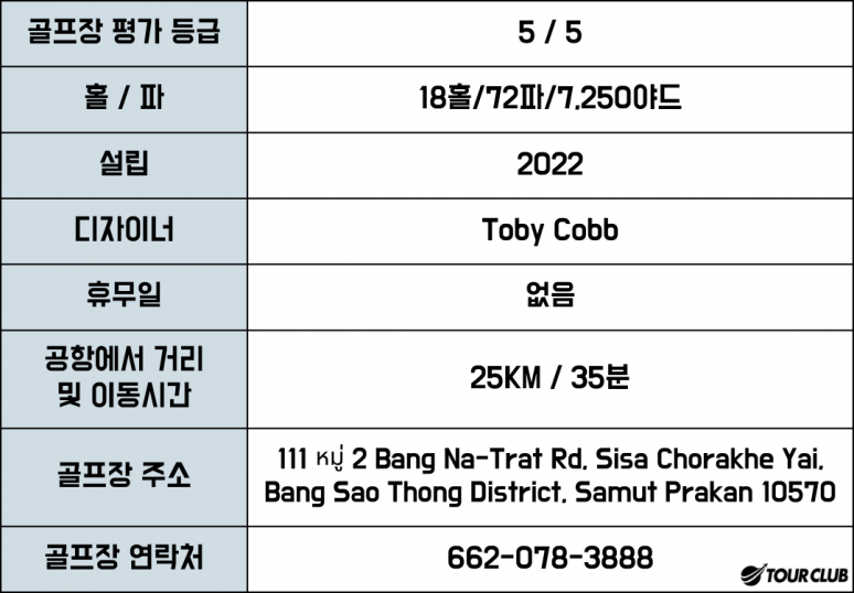 사뭇프라칸 지역에 신설된 시암 컨트리 클럽 방콕은 총 7,250 야드의 18홀 챔피언 쉽 코스이며, 디자이너 Toby Cobb이 디자인하여 멋들어진 코스를 자랑합니다.Toby Cobb 디자이너에 의해 디자인되었으며, 파타야 시암 올드 코스가 연상되는 코스라고 합니다.