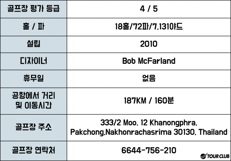 전체적으로 티 박스가 넓고, 평탄한 페어웨이 및 그린이 다른 카오야이 주변 골프장에 비해서 어렵지는 않지만 이를 만회 하기라도 하듯 많은 벙커와 해저드 및 파3, 파 4홀의 길이가 만만치 않고, 전반적으로 벙커가 많아 방심하다간 좋은 점수를 내기가 힘듭니다.