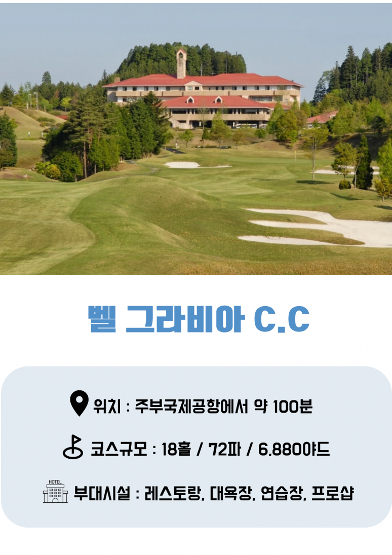 인천 국제공항 출발 나고야 국제공항 도착 골프장 이동(약 100분 소요) ▶벨 그라비아C.C 9H (셀프+카트) 석식 및 휴식 |