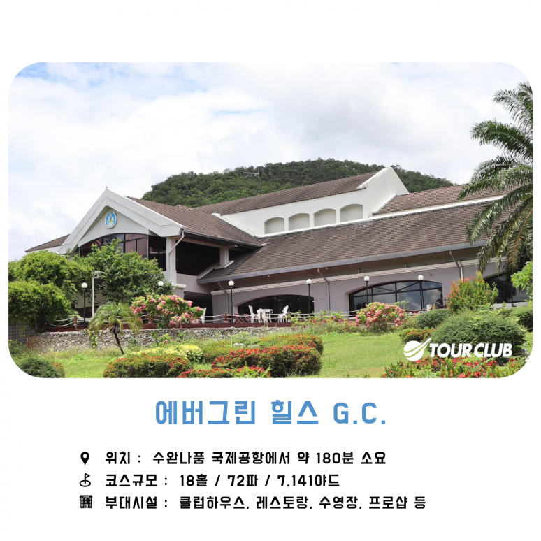 에버그린힐스는 해발700미터의 칸차나부리 고산지대에 위치하고 있어 습도와 기온이 낮고, 쾌적하고 신선한 바람의 영향으로 항상 시원함속에 라운드를 즐길수 있습니다.산맥들이 병풍처럼 둘러싸고 있어 수려한 자연풍경도 감상할 수 있으며 자연그대로의 모습으로 어우러진 페어웨이와 비단결같은 그린은 최고의 컨디션을 자랑하고 있습니다. 밀림이 무성한 나지막한 산들로 둘러싸인 골짜기에 위치한 골프장은 맑은 크리스탈 빛의 호수 경관이 일품이며 아웃코스의 3번,4번,6번홀,9번홀 그리고 인코스의 15번,16번,17번홀은 물을 어떻게 피해가느냐가 관건이며 아기자기한 골프장의 재미를 한껏 즐기실 수 있습니다.