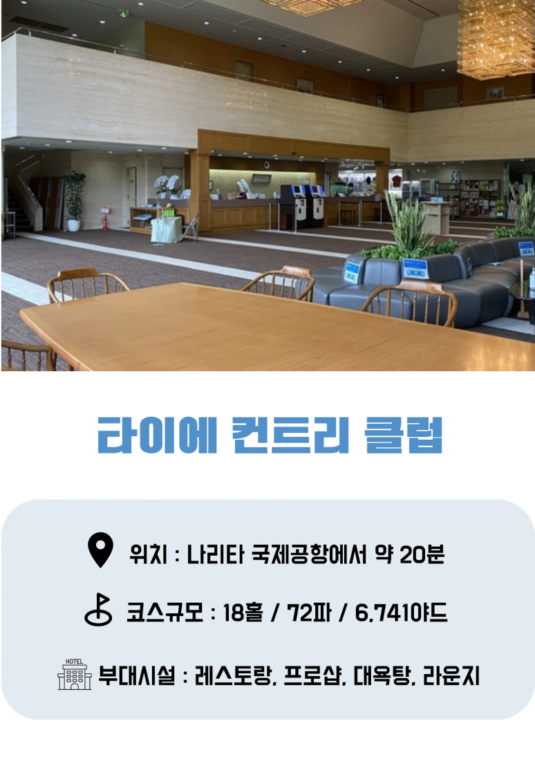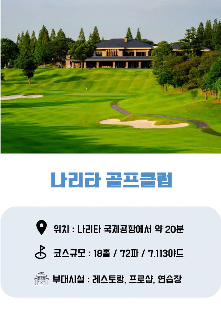 호텔 조식 후 체크아웃 > 골프장 이동 18홀 라운딩 공항으로 이동 나리타 국제공항 출발 인천공항 도착 |