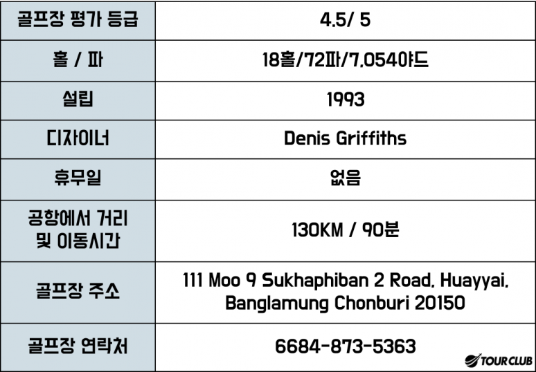 그 가운데 레이크 코스는 수많은 워터해저드를 갖춰 태국 내에서 가장 어려운 코스로 꼽힙니다.새로 지은 클럽 하우스와 깔끔한 관리상태, 수려한 경관이 더해져 동급의 다른 골프장에 비교 했을시 충분히 경쟁력 있으며, 오션 코스의 마지막 홀에서는 파타야의 바다가 내려다보입니다.