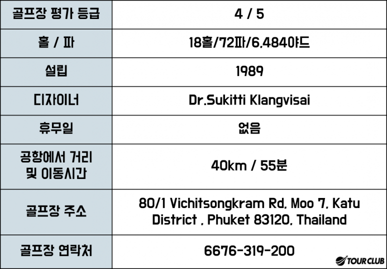 푸켓 컨트리 클럽은 1989년에 오픈한 푸켓 최초의 골프장이고 태국 남부 최초의 국제 표준 골프장으로서 많은 전국 대회를 개최해왔습니다.