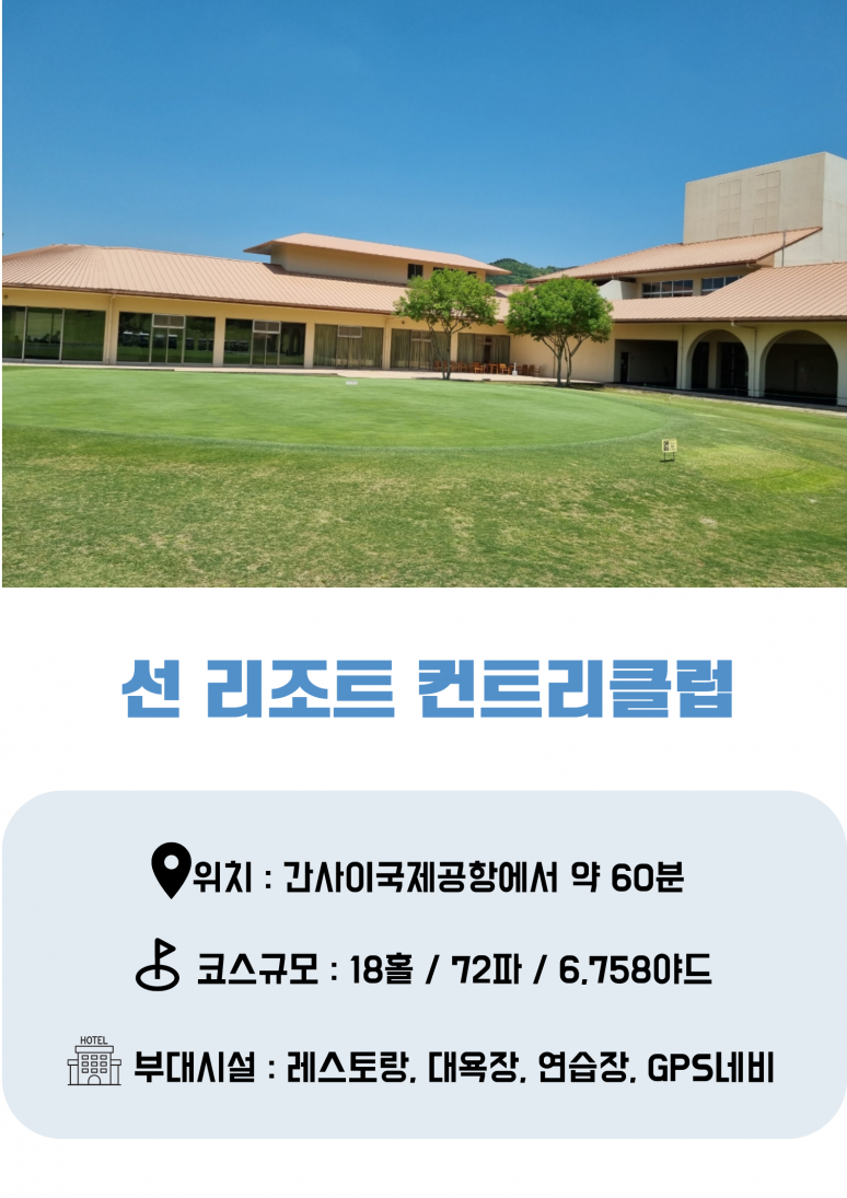 | 오사카 | 호텔 조식 후 골프장 이동 선 리조트, 이즈미사노, 사카이, 미사키, 키시와다 등 1곳 18홀 호텔 복귀 후 자유시간 |