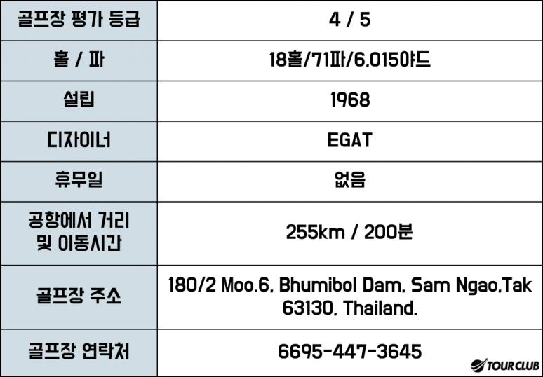 푸미폰 댐 (왕의 이름을 따서 명명됨) 아래 언덕의 낮은 경사면에 위치한 이 곳은 벙커는 최소화되고 플레이어는 슬로프를 위, 아래 및 가로질러 다양한 샷을 칠 수 있습니다.