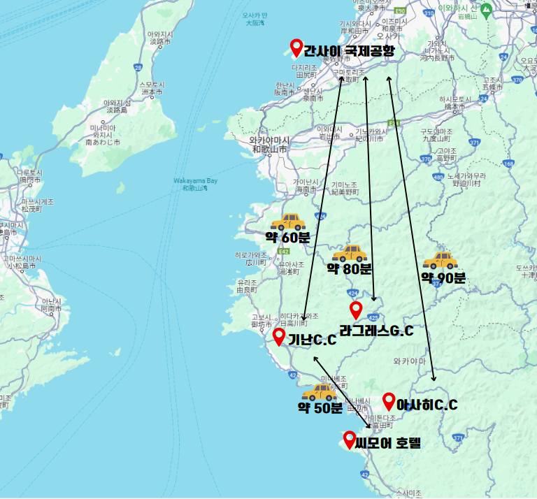 부산 김해 국제공항 출발 오사카 간사이 국제공항 도착 시라하마로 이동 (약 60분) 기난/아사히/라그레스CC 중 18H 라운딩 (일몰 시 까지/셀프라운딩) 호텔 이동 (약45분) 석식 후 온천욕 및 휴식 |