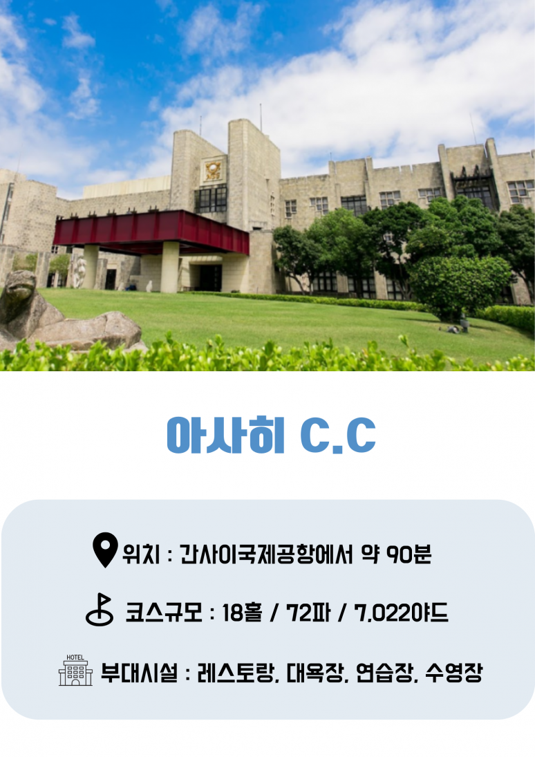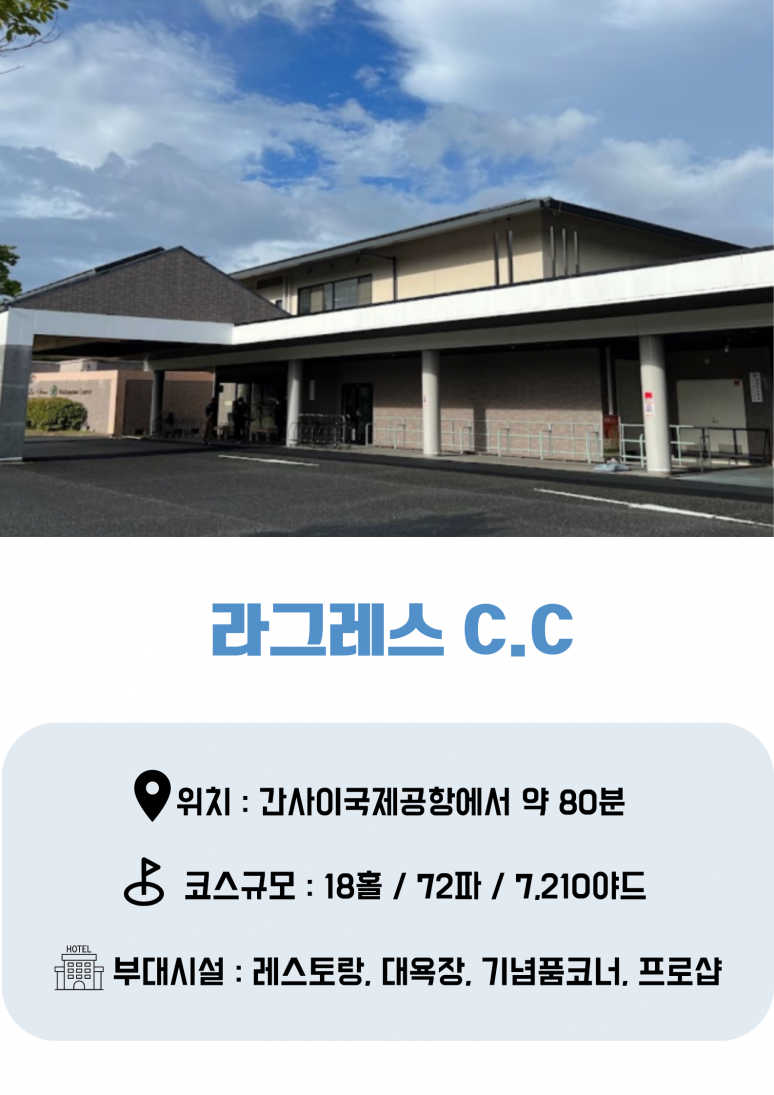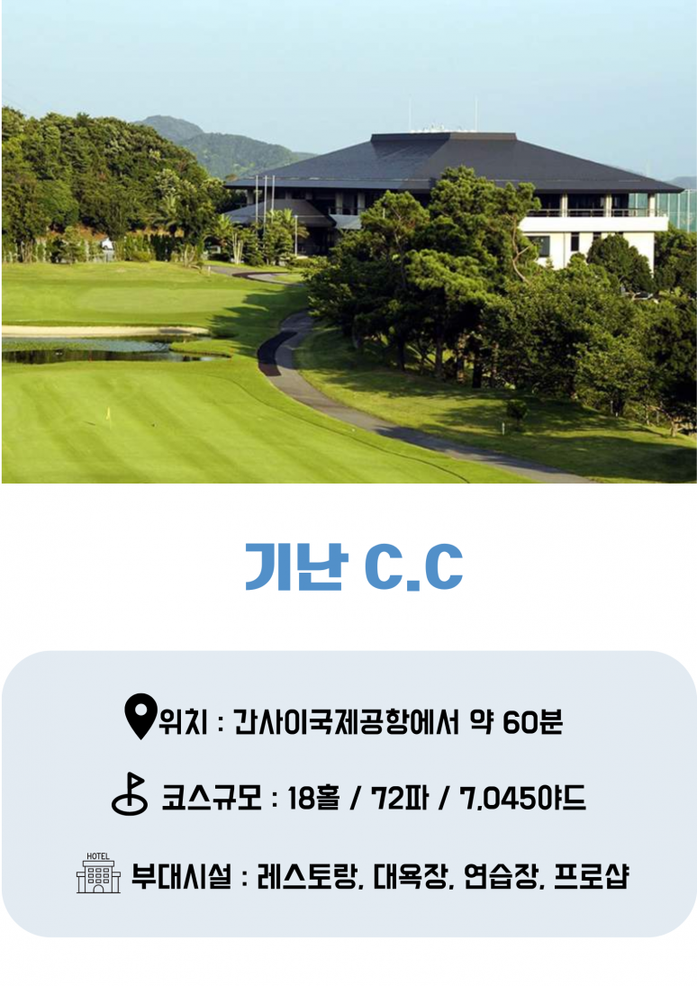 호텔 조식 후 골프장으로 이동 기난/아사히/라그레스CC 중 18H 라운딩 (일몰 시 까지/셀프라운딩) 공항으로 이동 (시간에 따라 최대 쇼핑몰 자유쇼핑) 오사카 간사이 국제공항 출발 부산 김해 국제공항 도착 |
