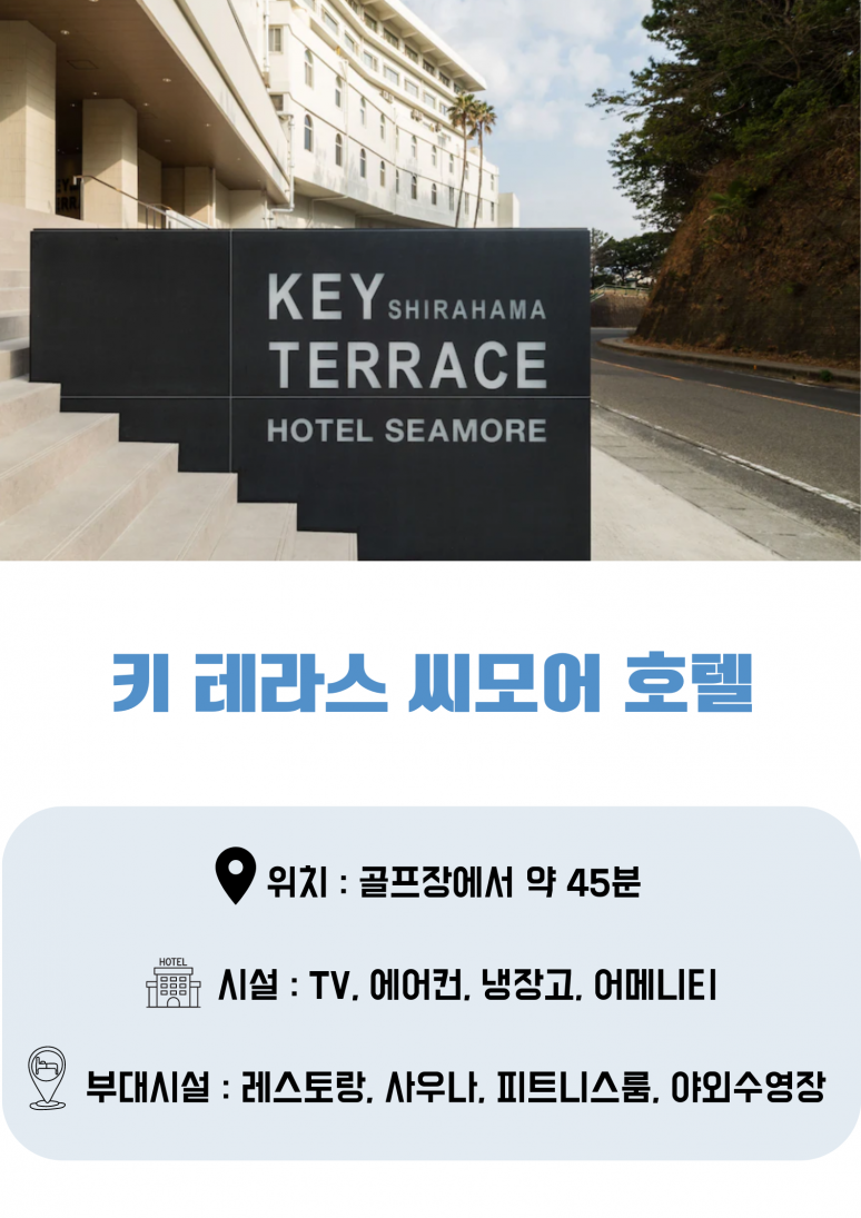 | 시라하마 | 호텔 조식 후 골프장으로 이동 기난/아사히/라그레스CC 중 18H 라운딩 (일몰 시 까지/셀프라운딩) 석식 후 온천욕 및 휴식 |
