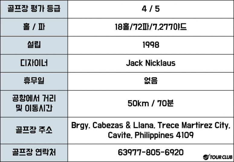 셔우드 힐스 골프장은 넓은 페어웨이를 자랑하고 있고 나무나 주위의 환경은 한적한 편이나 플레이를 하기에는 많은 재미를 느낄 수 있는 코스입니다. 필리핀의 지리적 요건을 잘 이용하여 설계되었으며, PAR3 6번홀은 시야 확보가 잘되어 많은 사람들이 홀인원을 노리는 곳이며, 12번홀과, 18번홀은 가장 어려운 그린으로 골퍼들에게는 다소 어려울 수 있습니다. 페어웨이나 그린도 잘 가꾸어져 있어 한국인들이 플레이하기 가장 적합하고, 편안한 코스입니다.