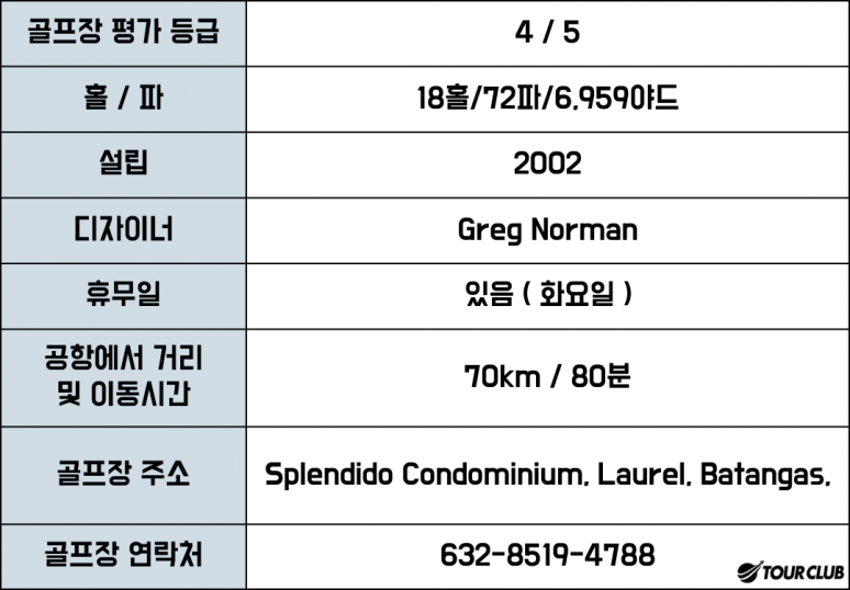 스플렌디도 골프장은 따알 호수와 따알 화산이 보이는 따가이따이 고산 지대에 위치해 있으며, 따알 호수의 경사면에 지어져서 호수를 향해 공을 치는듯 가슴이 후련해지는 뛰어난 전경을 가진 골프장입니다.