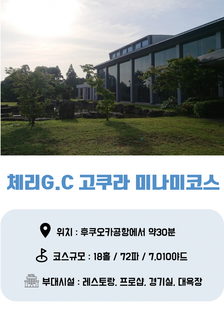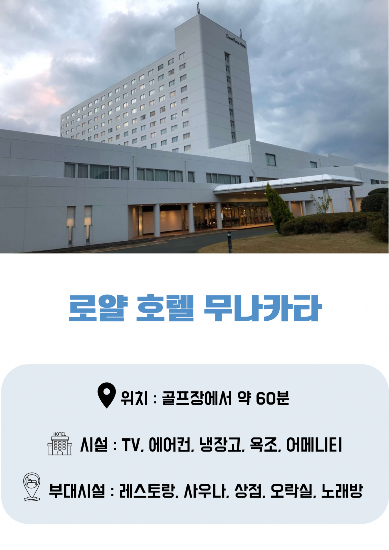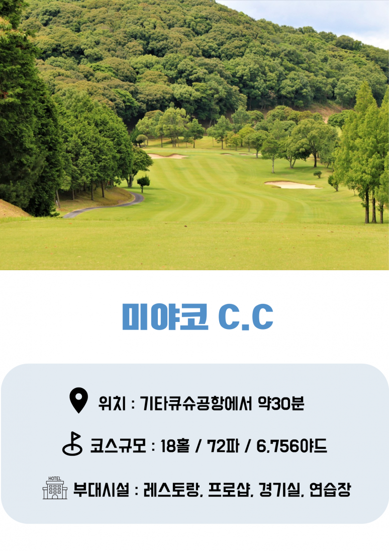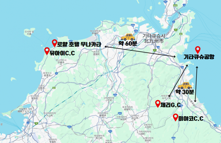 인천 국제공항 출발 기타큐슈 국제공항 도착 한국인 기사 안내원 미팅 후 골프장으로 이동 ▶ 미야코CC 또는 체리CC 중 1곳 18홀 라운딩 (지정불가) 라운딩 후 호텔로 이동 (약60분소요) 호텔 체크인 후 석식 및 온천욕 |