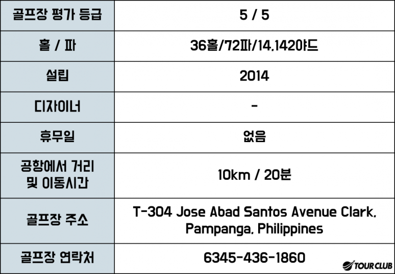 필리핀의 전설을 간직한 피나투보의 정글을 끼고 있는 클락코스 18H(6871야드)는 야자나무와 정글이 함께 어우러져 있어 정글에 온 듯한 느낌을 줍니다.
