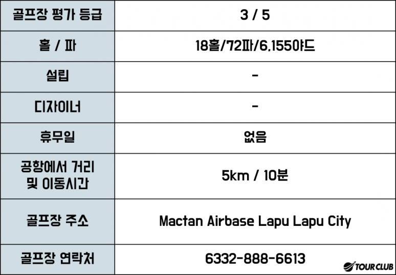 막탄의 산호섬에 있으며 국제공항과 매우가깝습니다. 페어웨이는 비교적 좁지만 다행히 전체코스는 꽤 평탄합니다.
