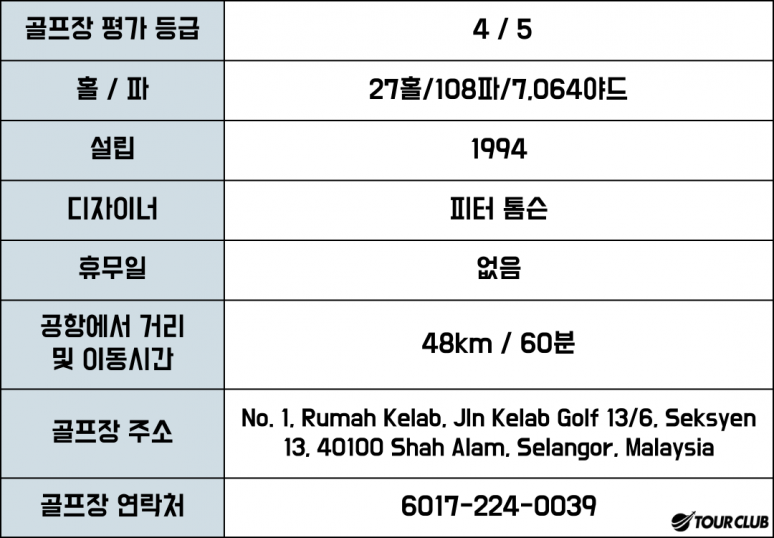 Kelab Golf Sultan Abdul Aziz Shah의 27홀 레이아웃은 위치뿐 아니라 게임의 "왕" 중 한 명인 디자이너 Peter Thomson에 의해 왕족과 연결되어 있습니다. 끊임없이 물결치는 Thomson의 레이아웃은 3개의 9홀 루프(프레지던트, 술탄, 알람 샤)로 구성되어 있으며, 각 루프는 클럽하우스에서 떨어져 있다가 다시 클럽하우스로 올라갑니다. 지형의 자연스러운 기복과 호수의 아름다움, 25,000그루 이상의 나무와 관목을 활용하여 그림 같은 풍경을 만들어냅니다. 공원 KGSAAS 코스는 지나치게 드라마틱하지 않으면서 도전적입니다. Thomson의 트레이드마크인 팟 벙커, 구불구불한 페어웨이, 중대형의 높은 그린은 모두 강력한 특징을 가지고 있습니다.