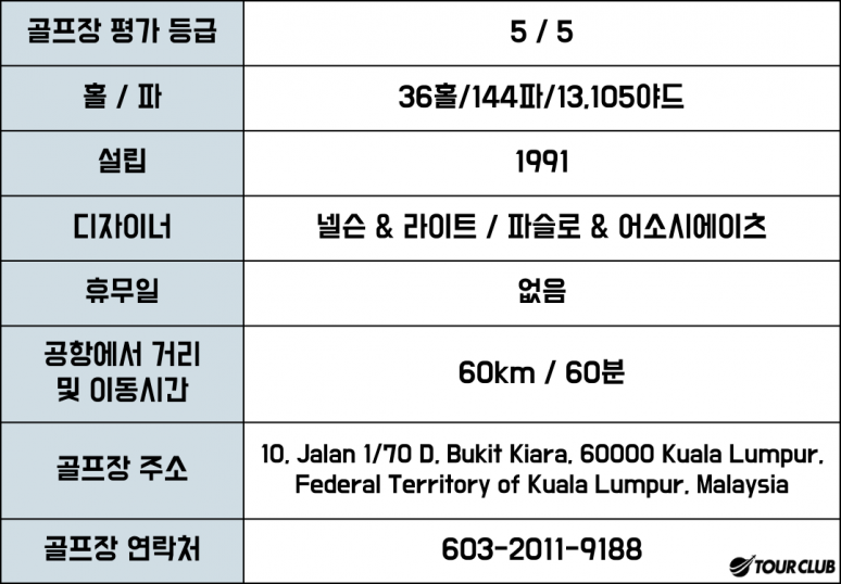 쿠알라룸푸르 동부 코스는 공원 스타일로 아름답고 선명한 색상의 조경을 갖추고 있습니다. 이 18홀 챔피언십 경기장은 2010년 말레이시아 전체에서 4번째로 좋은 코스로 선정되었습니다. 땅의 아름다움을 최대한 활용하고 자연과 조화를 이루는 느낌을 주는 디자인입니다. 이곳은 천연 풀과 습지를 제공하며 수많은 야생 동물과 새에게 자연 서식지를 제공합니다.