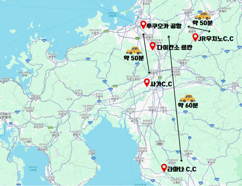 | 후쿠오카 | 호텔 조식 후 골프장으로 이동 하단 골프장 중 1곳 9홀 - 18홀 라운딩 예정 (지정 불가) -니조,사츠키,치쿠시노오카, 치쿠시노, JR우치노, 오고리, 브리지스톤, 사가, 타마나 또는 동급 라운딩 후 호텔로 이동 후 자유시간 |