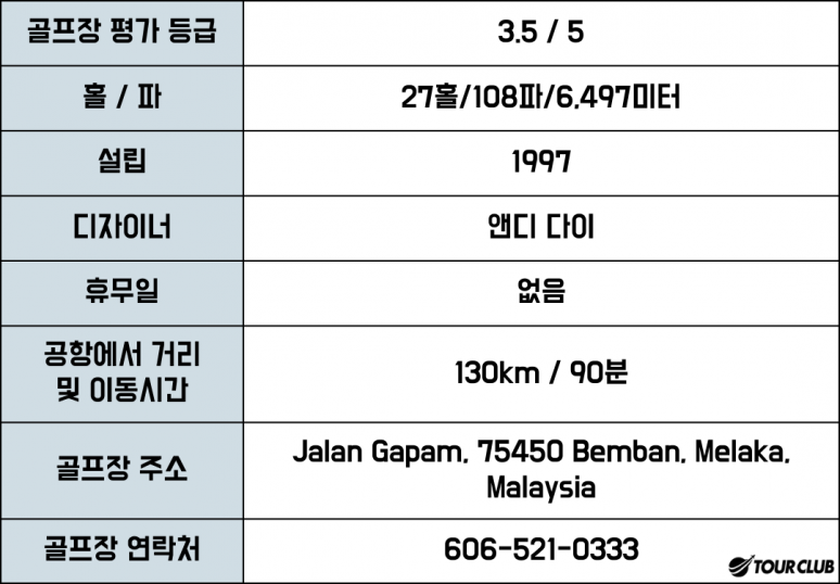 동쪽(홀 1~9), 서쪽(홀 10~18) 및 북쪽(홀 19~27)의 3개 9홀 루프로 구성되었으며, 전면적인 창조물은 무겁게 쌓인 페어웨이, 상당한 고도 변화, 대형 폐기물 벙커 및 많은 구멍을 양분하는 호수와 개울. 나무와 정글 식물은 대부분의 다른 말레이시아 골프 코스에 비해 특징이 적습니다. 넉넉한 너비의 페어웨이는 대타자의 천국을 제공하지만 Orna의 주요 과제는 잘 보호된 그린 주변에서 찾을 수 있습니다. 그린 자체에는 롤러코스터 같은 경사가 많아 둘로 내려가는 것이 종종 어렵습니다.