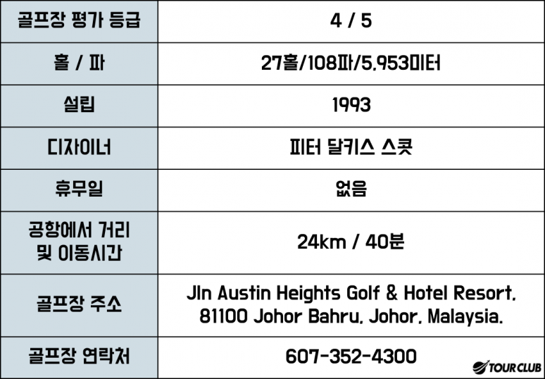 모든 티박스는 높은 곳에 위치해 있으며, 위협적인 계곡을 지나 페어웨이에 도착해야 하는 홀이 많이 있습니다. 게임에 약간의 테스트를 추가하기 위해 기복이 심한 페어웨이가 많고 각 홀은 원래 언덕이 많은 지형의 자연 땅을 조각했습니다. 좁은 페어웨이와 작은 그린으로 인해 좋은 득점을 위해서는 적절한 코스 관리가 말레이시아 골프장 전체에서 필수적입니다.