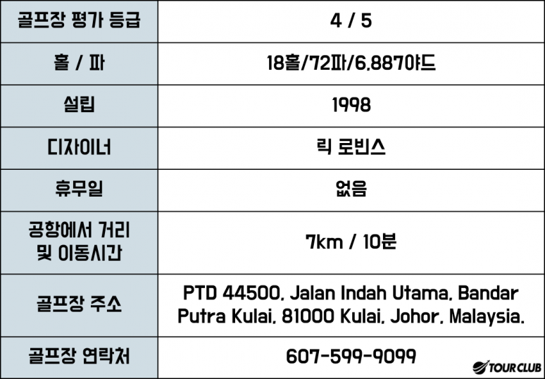 유명 건축가인 릭 로빈스(Rick Robbins)가 설계한 이 리조트에는 3개의 9개 골프장(팜 코스, 푸트라 코스, IOI 코스)이 각각 독특한 골프 경험을 제공합니다. 자생 야자수로 둘러싸인 풍경은 구눙 풀라이의 웅장한 전망을 제공합니다. IOI 팜 빌라는 둑길을 따라 짧은 여행을 하는 현지인과 싱가포르인에게 인기 있는 코스입니다.