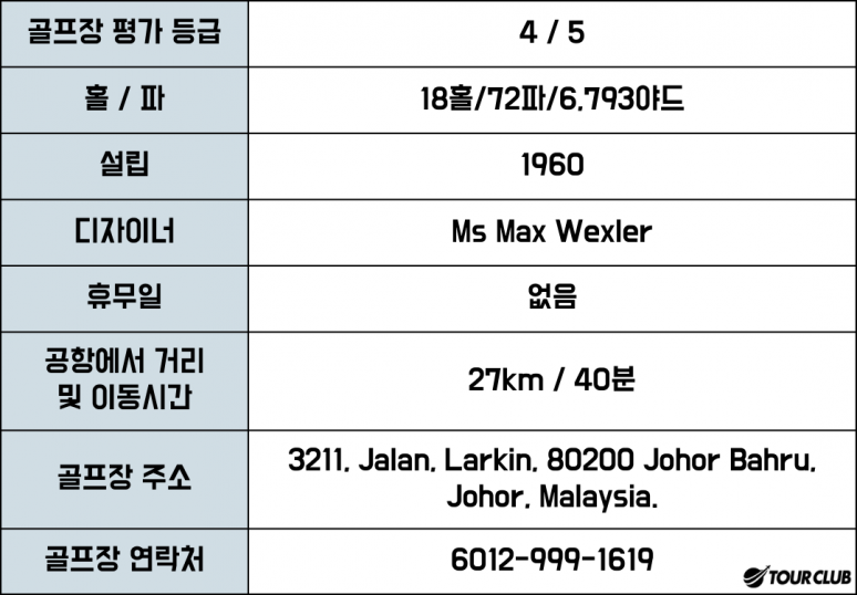 1991년에 코스는 유명한 디자이너 Max Wexler에 의해 재설계 및 업그레이드되었습니다. 리노베이션을 통해 모든 퍼팅 표면에 새로운 버뮤다 Tifdwarf가 적용되었습니다. 게다가 새로운 티박스, 자동화된 관개 시설, 6개의 추가 호수로 플레이 가능성과 도전성이 향상되었습니다. 그 이후로 조호르 골프 & 컨트리 클럽은 주목할만한 우승자인 KJ Choi와 Retief Goosen과 함께 2007년부터 2009년까지 Iskandar Johor Open을 포함하여 여러 프로 이벤트를 개최했습니다.