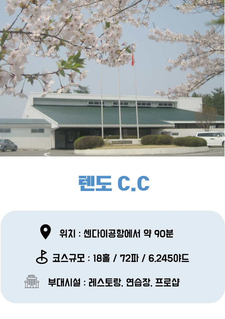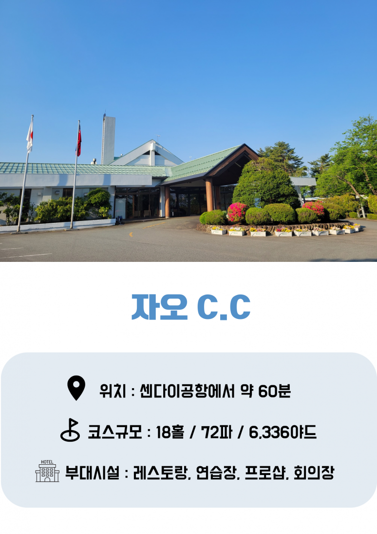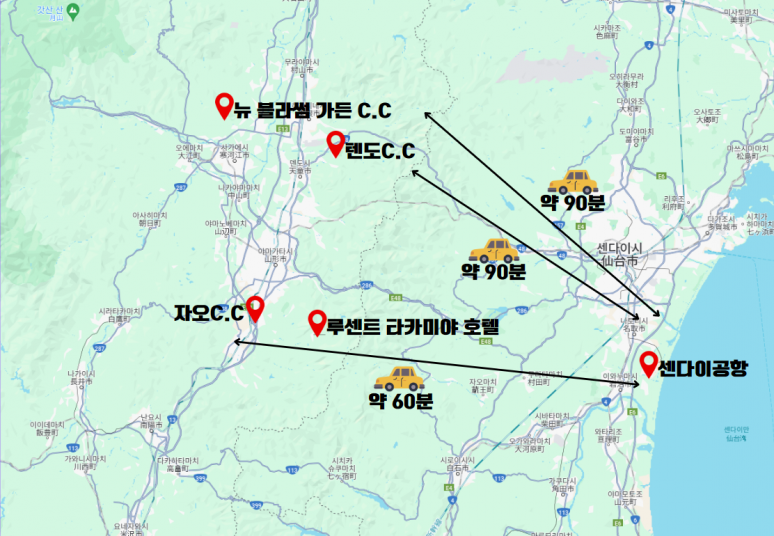 | 호텔 조식 골프장 이동 (약 20분 - 50분) ▶텐도CC / 뉴 블라썸 가든CC / 오이시다 G.C / 자오CC / 야마가타G.C 상기 골프장 중 한 곳에서 18홀 라운드 (셀프+카트 라운드) 호텔 석식 후 휴식 (온천욕) |